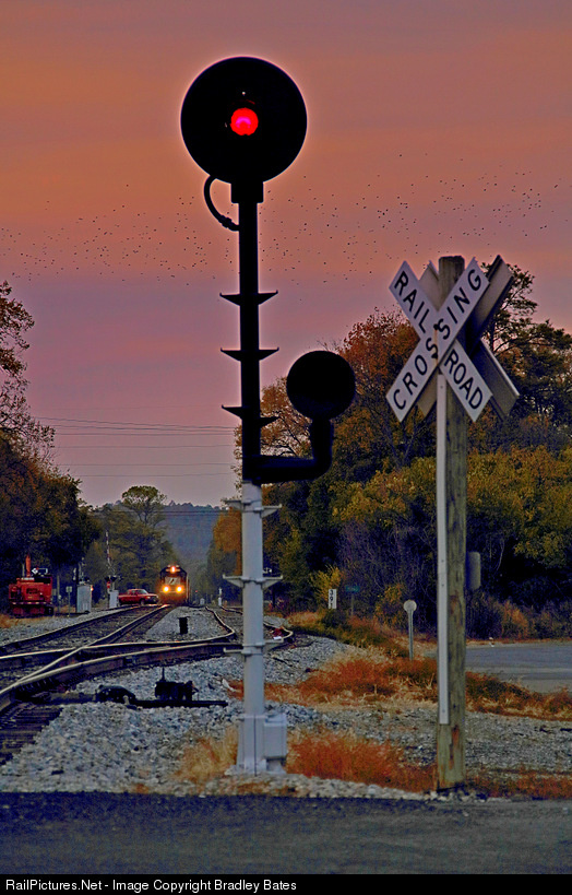 | It doesn't get much better than this. An SD70 Standard Cab leading a Road Freight, an old Search Light Signal & a beautiful sunset... NS 198 is seen in the distance stopped at CP King in Sylacauga, AL. Waiting permission to pass a stop Signal where they can continue Eastbound |