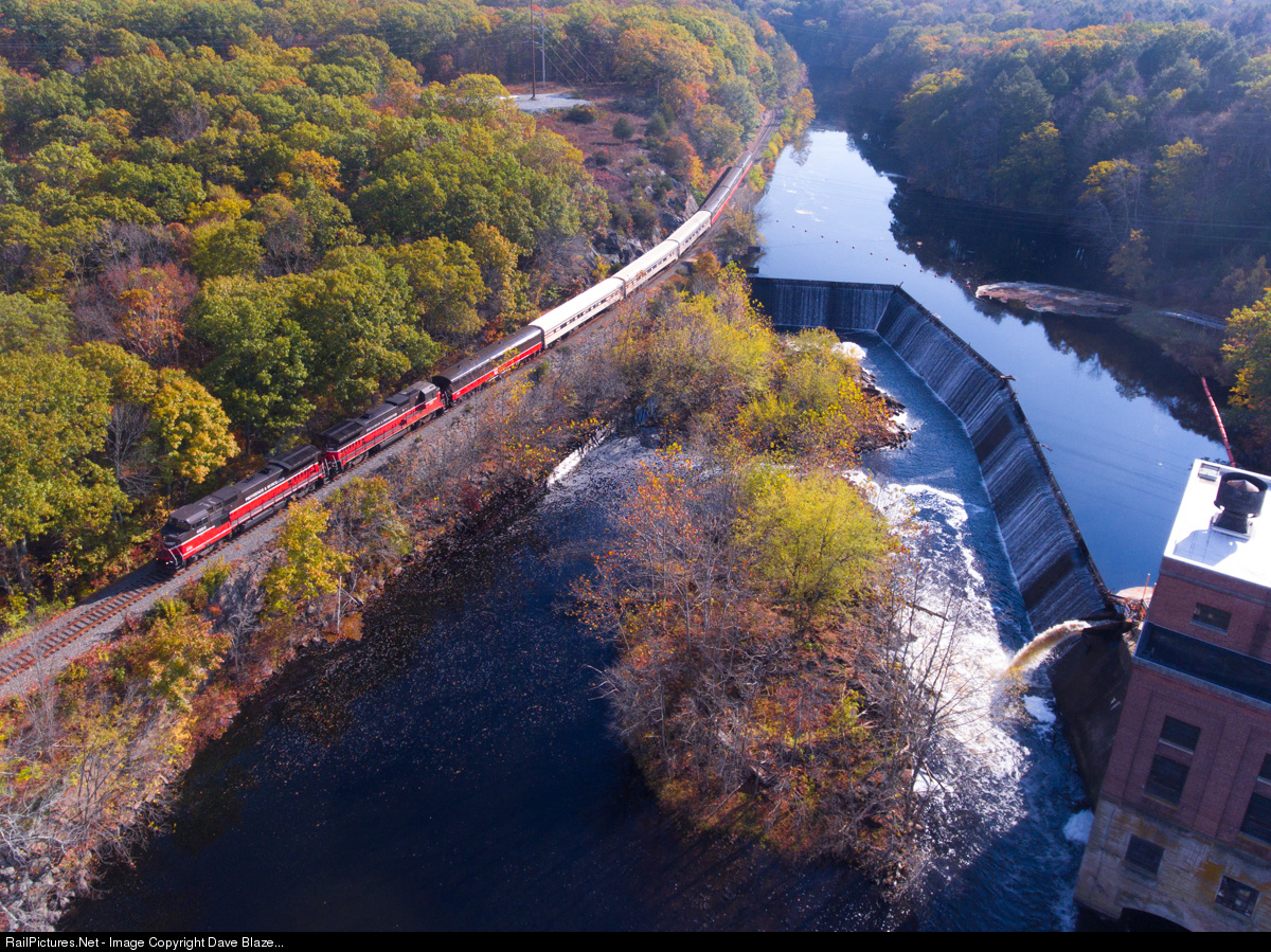 This particular trip was operated by the Mass Bay RRE and ran from Worcester to Groton on the P&W Norwich main (70 miles), then down Amtrak's Shoreline to Old Saybrook (20 miles), where steam power took over for a trip to the old New Haven Valley Line to north of Haddam, CT (13 miles) for a grand total round trip of over 210 miles. Here we see the train as it has just exited the Taft Tunnel southbound and is passing the falls at Northeast Utilities, Tunnel Hydroelectric station.