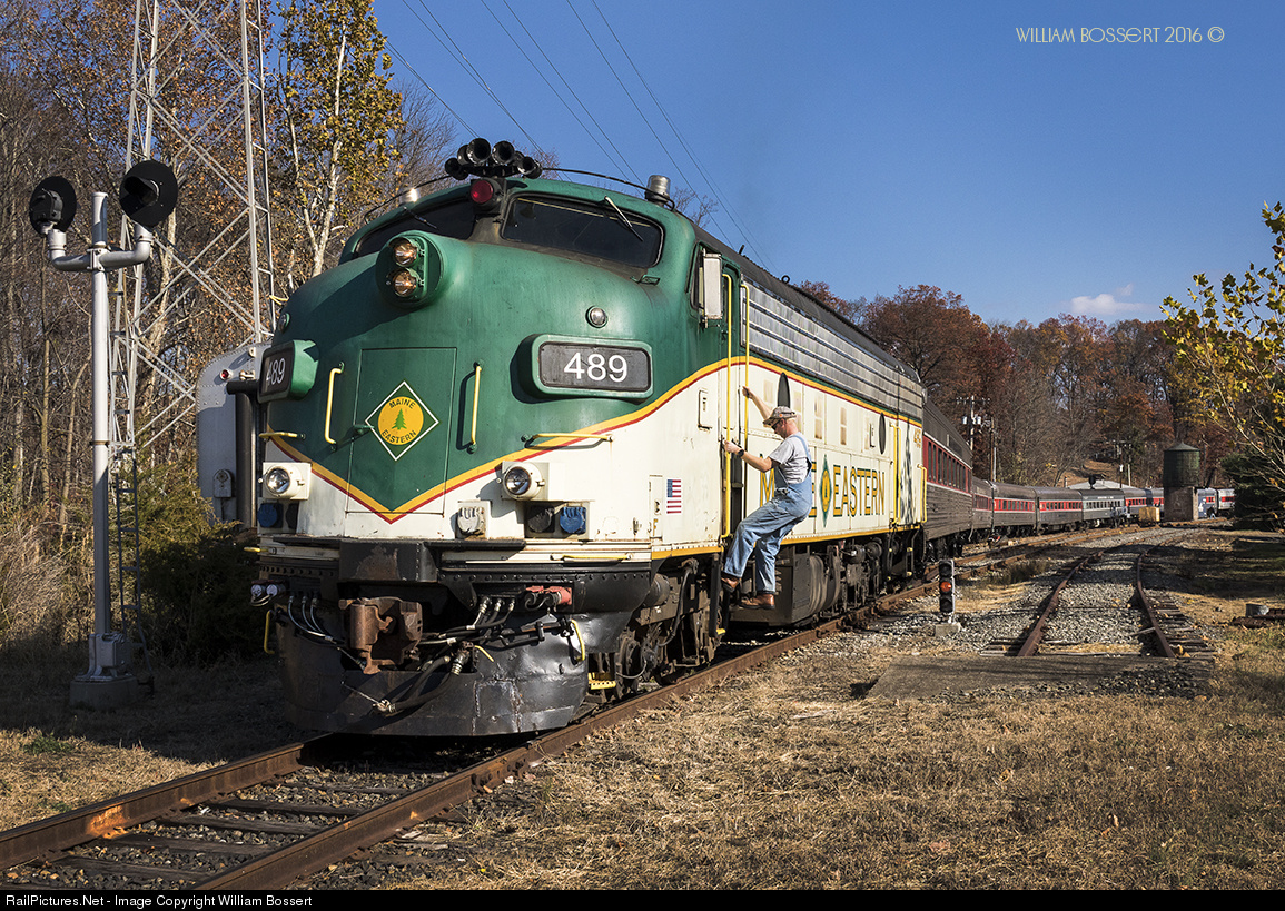 Morristown and Erie with there Maine Eastern FL9's as a pull pull with ten passenger cars just completed a test run near the Whippany station and yard for the up coming Polar Bear excursions for the holidays. The engineer is just departing the cab of 489. |