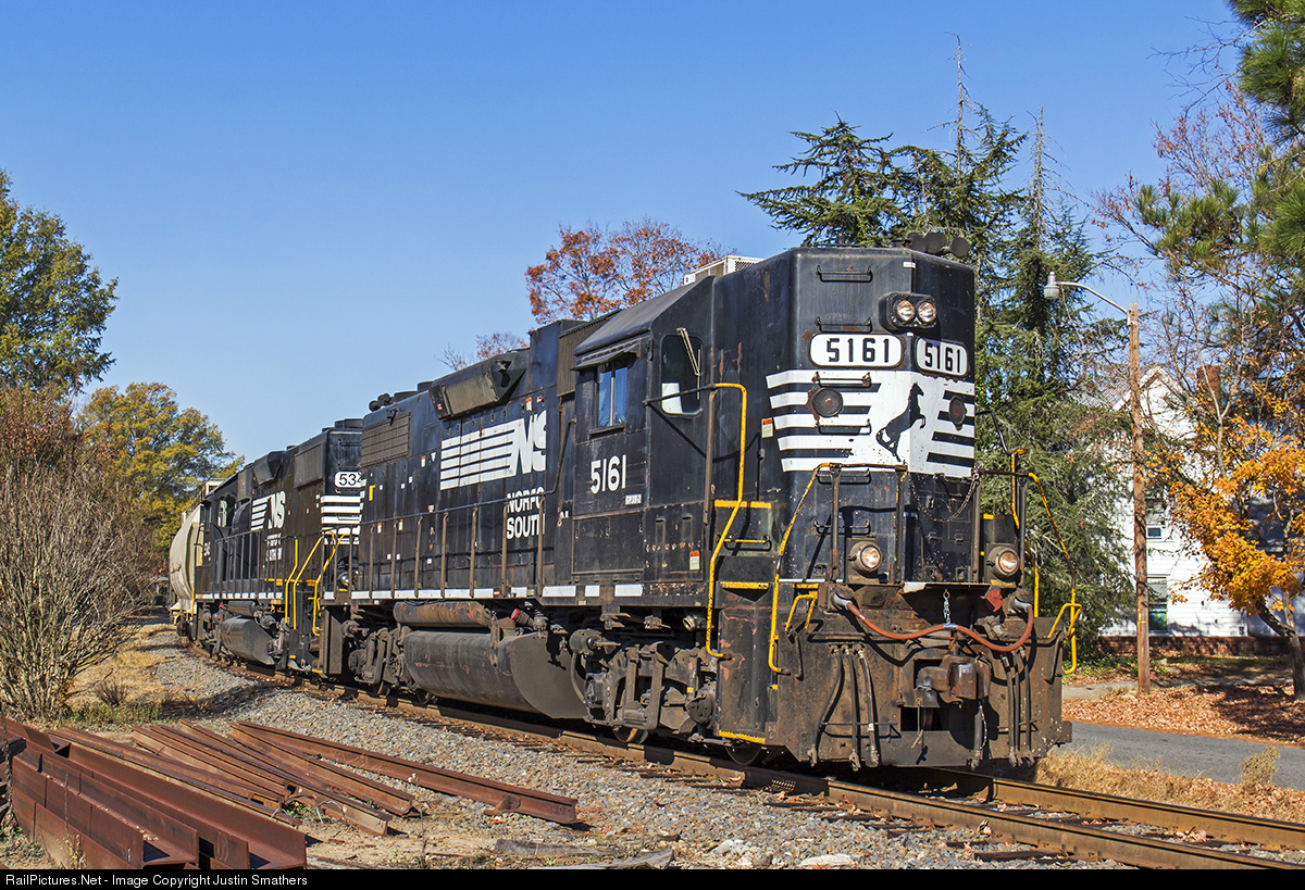 | NS P92 through the small town of Granite Quarry, NC as they begin the day's work on the N-line from Salisbury, NC to Albemarle, NC. |
