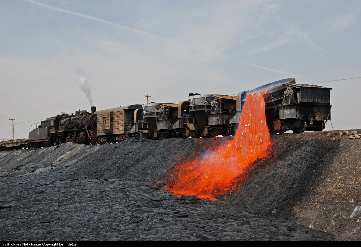Man-made lava pours out of a slag car on the Baiyin Non-Ferrous Metals Railway. This slag tip was relatively hard to get to and was not visited by many enthusiasts who stopped by Baiyin over the years. Fortunately, I made it out here once to see the tipping operation and it was well worth the two mile walk through factories. The tipping operation ended in July 2011, shortly after this picture was taken and the railway was replaced by special German trucks who now perform the same slag service.
