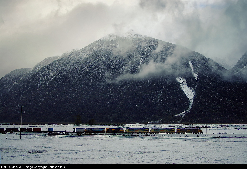 Trains on 3' 6" (1.067m) track from Whangarei to Bluff with virtually heritage rebuilt EMD and GE locomotives still the mainstay power. The network was privatized in 1990's and operated by Toll until 2008 when state owned KiwiRail was established.