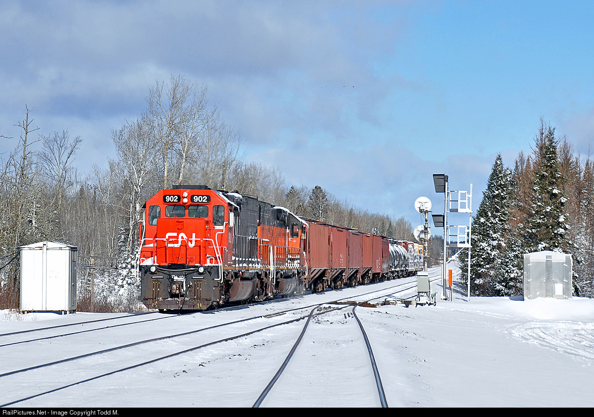 | Having just left Keenan yard, BLE 902 and crew sit basking in the suns rays at N. Fairlane waiting on a CN land barge that's coming up the CN Missabe Sub. Once it clears its back underway for Proctor with their short train. |