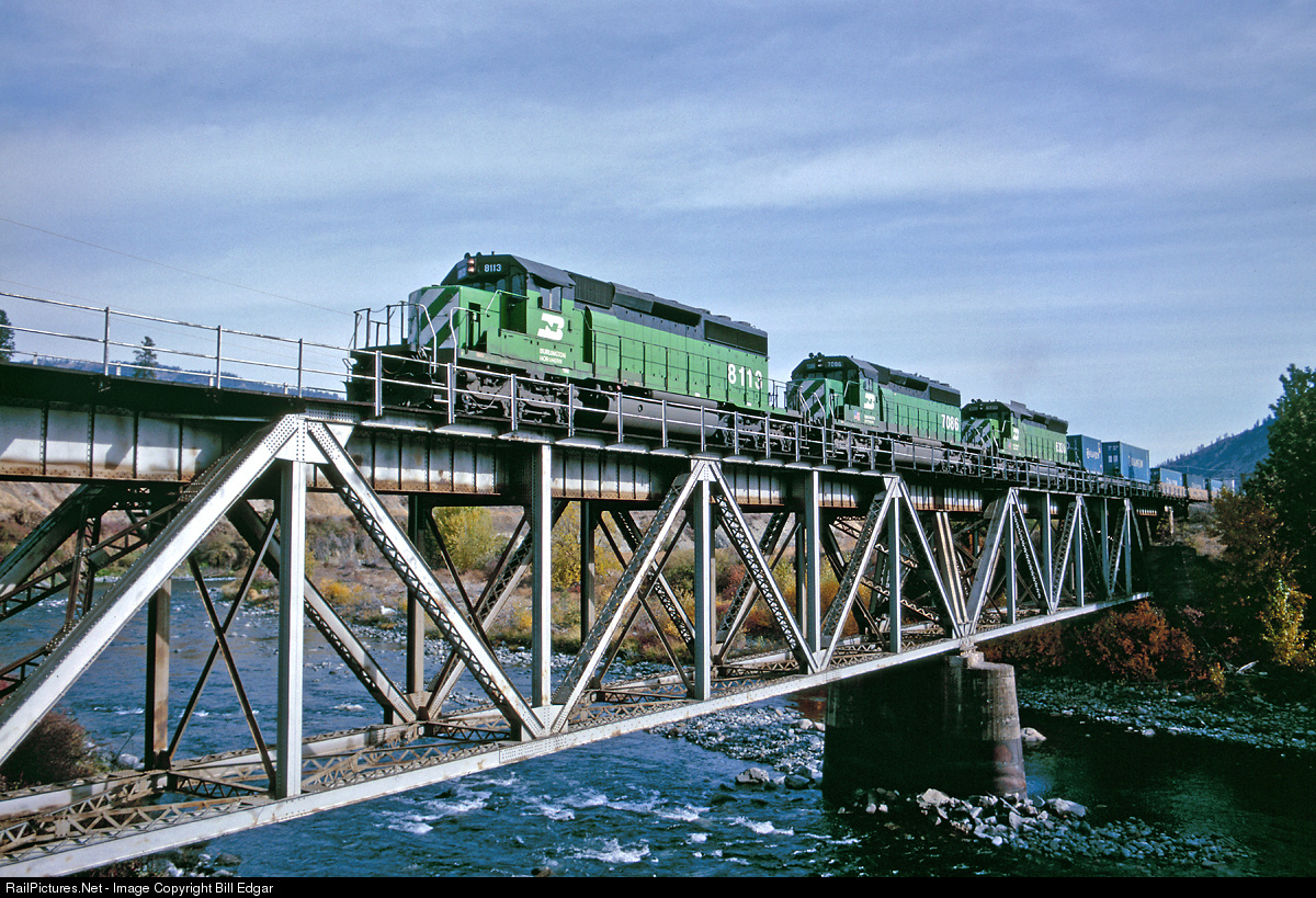 The end of an era. By late 1994 it was becoming more difficult to capture BN SD40-2s in their original scheme in complete consists. Tiger stripes, white faces and leasers had invaded the system, along with new SD70MACs. Next would be the ATSF merger. Even this shot of a stack train crossing the Wenatchee River at Dryden, WA has an intruder in the form of SD CAT no. 6330. I'll forgive it because the paint matches and it looks pretty cool with the air deflectors and SD45 style radiator.