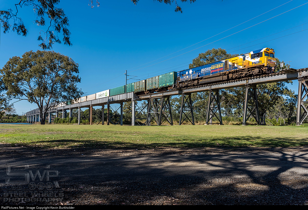 Pacific National Queensland's class Downer EDI Rail GT42CU AC, PN 001, is seen leading northbound PNQ intermodal train 82P3 over the 1,742-foot-long bridge over the Burnett River at Bundaberg, Queensland, Australia.
