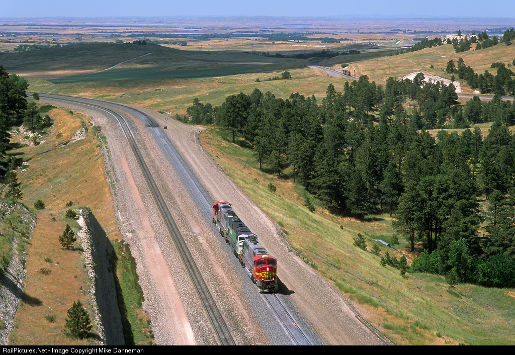Drifting down Track 2 west of Belmont, Nebraska, is a westbound helper set heading back to Crawford after pushing another coal train up Crawford Hill on July 12, 2008. The locomotives are heading into the horseshoe curve after passing Windy Point, and are pacing another set on Track 1 seen on the lower leg of the curve in the background. Both helper sets are made up of a pair of former Santa Fe/BNSF warbonnet-clad EMD SD75Ms sandwiching a former Burlington Northern Cascade green SD60M.