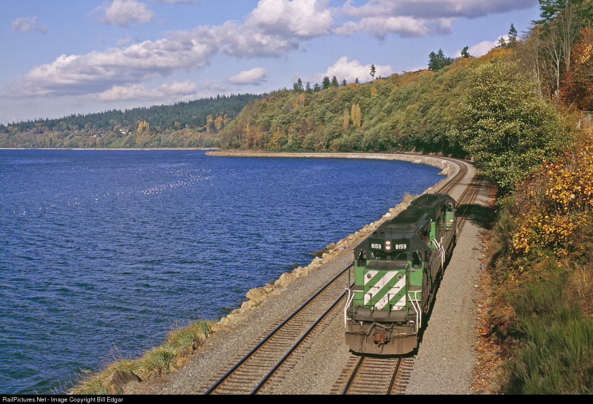 | BN 8159 and mate are out for a stroll along Puget Sound on the former Great Northern mainline between Seattle and Everett. The 8159 is the trailing unit as the light power heads north toward Everett for a train assignment. Passengers can enjoy this waterfront trackage on Amtrak's Empire Builder, Cascades service or on Sound Transit commuter trains. |