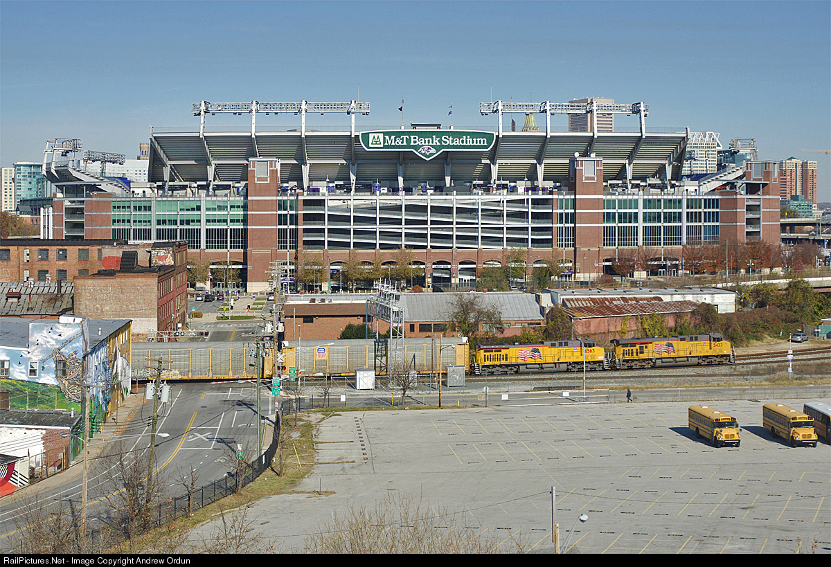 | Far from home... A pair of UP units lead Q296-20 eastbound through Bailey interlocking on the Baltimore Terminal Subdivision, passing M&T Bank Stadium, the home of the Baltimore Ravens. |