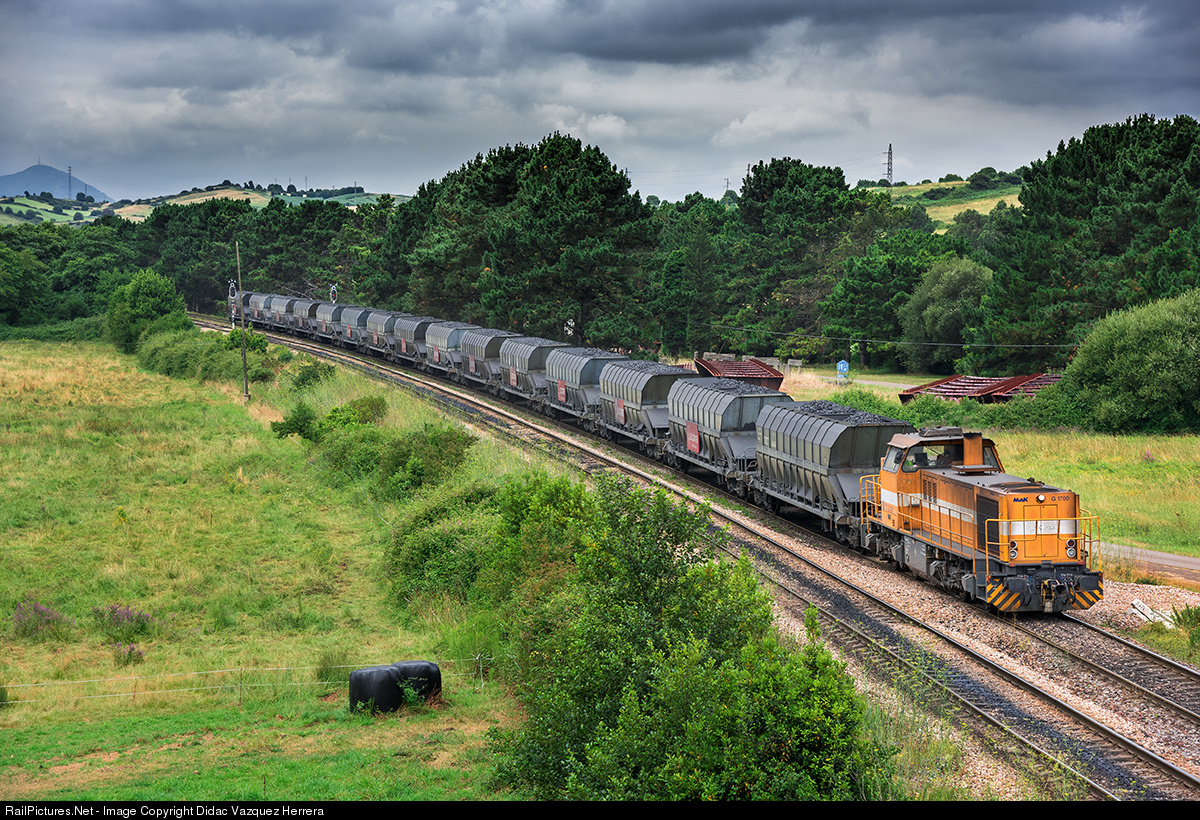 | coke coal train from Avilés for the kilns of Veriña, near El Cueto with the hoppers of Acciona and the Mak 317-002 of Comsa. |