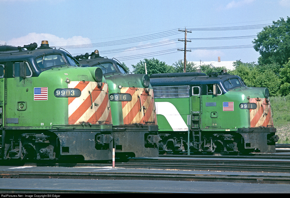 One of the favorite faces in railroading, EMD's bulldog nosed E and F units is on display at Burlington Northern's Metra coach yard at Aurora, IL in June 1991. The Es, rebuilt by Morrison-Knudson were the backbone of BN's commuter service since the mid 1970s, but would soon be retired in favor of more modern power. Prior to rebuilding the Es were part of the Burlington's Zephyr fleet and rotated between high speed Zephyr service and the commuter assignments.