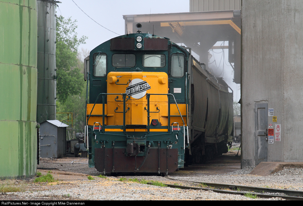 Grain dust floats over covered hoppers as DeBruce Grain No. 4153 loads four cars at the company’s grain elevators at Fremont, Nebraska, on May 22, 2014. The paint scheme and worn nose logo easily identify the rebuilt EMD GP7 as a former Chicago and North Western locomotive.