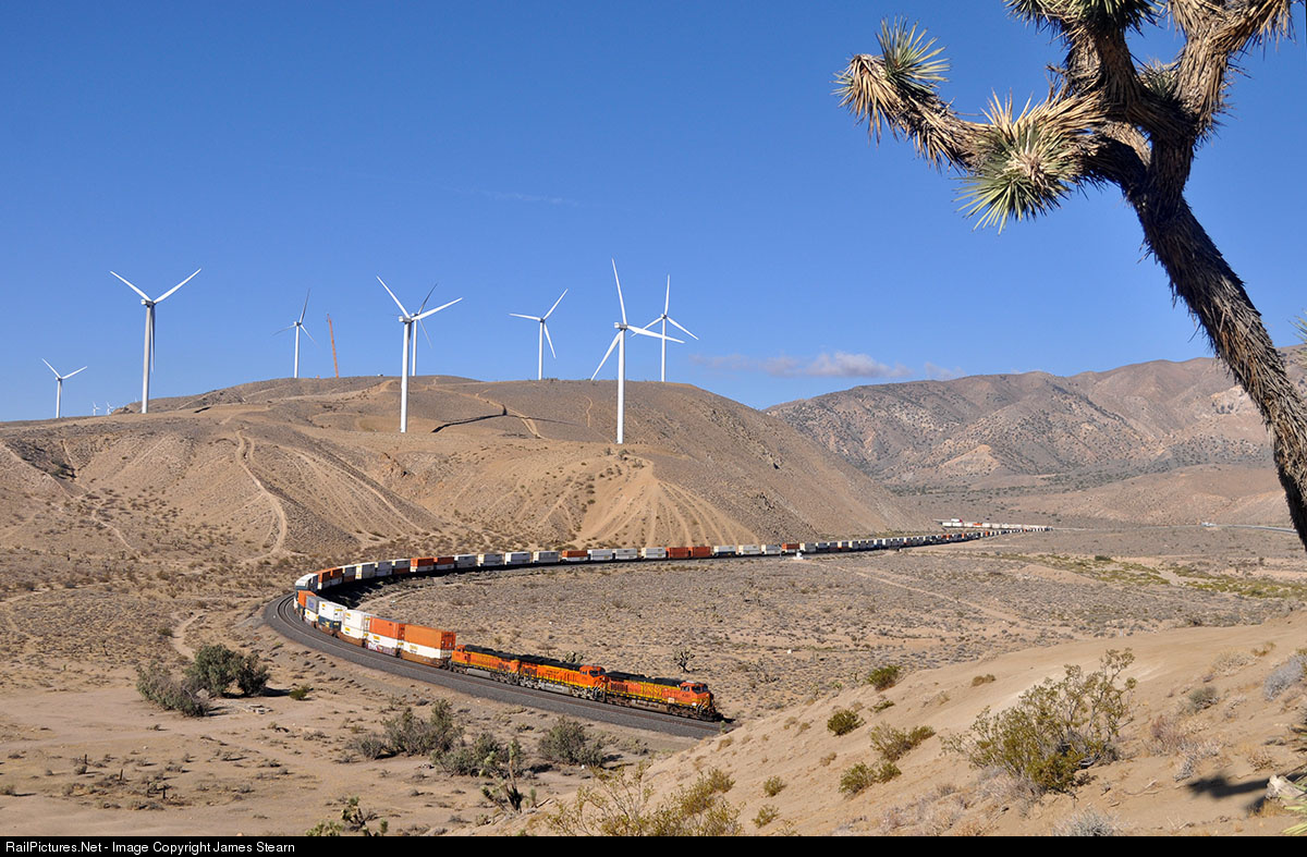 BNSF Dash 9 4361 leads classmates 3790 and 4009 as they round the Warren Curve on their descent from the Tehachapi Pass. Only the wind turbines give any suggestion of just how windy it was at the top of this hill among the Joshua trees.