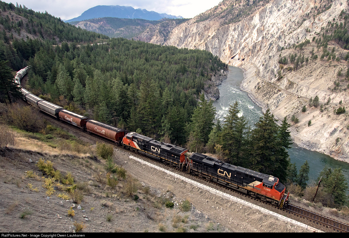 | Canadian National 2866 works grain empties eastbound on CP's Thompson Sub. Across the river, CN's own Ashcroft Sub may as well be on another planet; its multitude of rock sheds and slide fences are a testament to the challenges faced by predecessor Canadian Northern as it followed the CPR down the Thompson and Fraser Rivers to tidewater. |