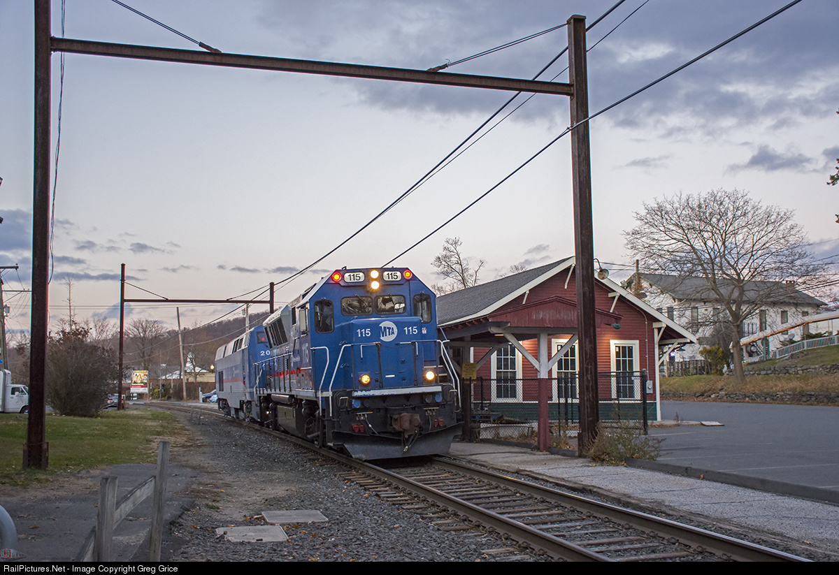 | "Shop Move on the Danbury Branch" Metro North Extra 115 with BL20GH 115 tows P32AC-DM 206 past the old Bethel Station on the Danbury Branch during the last lit hour of the day. The shop move originated from Danbury Station and made it's way to Stamford Yard before continuing to Croton Diesel Shops, where the P32 would receive needed repairs. |