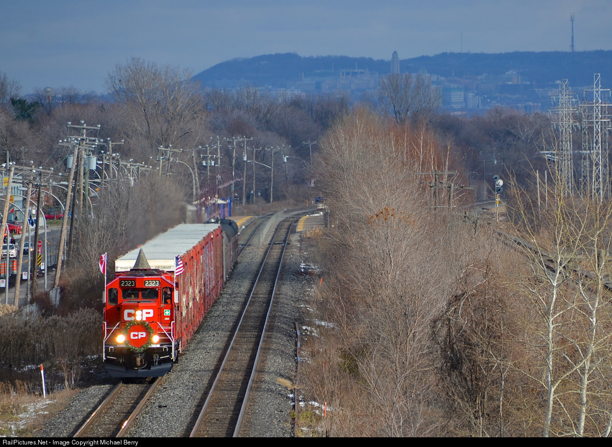 The CP Holiday Train is heading for shows in Ontario, with CP 2323 leading a 62-car axle train through Pointe-Claire. Up ahead are stops in Finch, Merrickville, Smiths Falls and Perth.