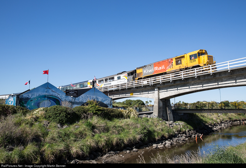 | DFB7239 roars away from Kaikoura with the south-bound 'Coastal Pacific,' crossing over Whaleway Station Road (...yes, it goes to the railway station and the whale watching centre) and the main street. Three weeks later this region was devastated by a magnitude 7.8 earthquake, severely damaging the railway north of here. At the time of writing The Coastal Pacific has been cancelled for the remainder of its summer season, and repairs to reopen the railway are expected to take as long as 12 months. |