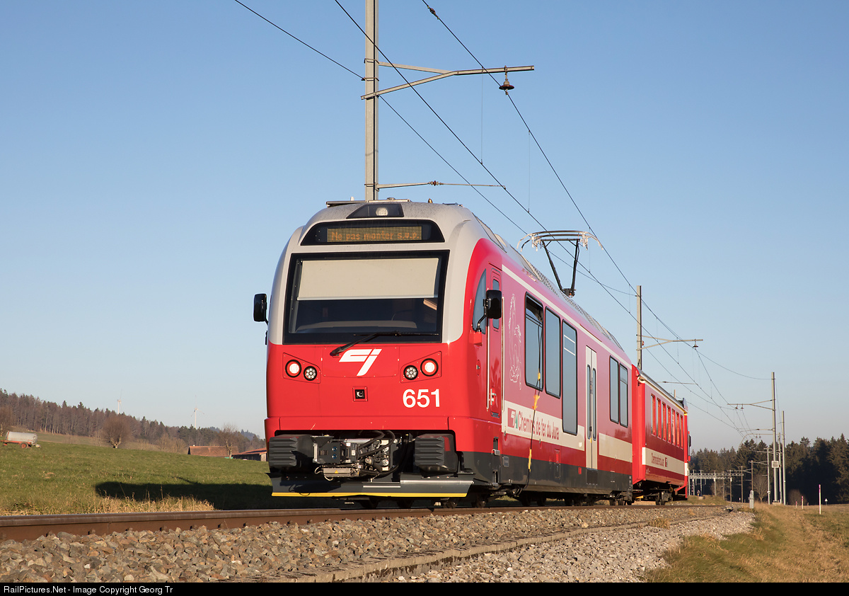 Test run of a brand new electric railcar Be 4/4 # 651 from Stadler Rail for the Chemins de fer du Jura (CJ) near Pré-Peititjean. The cab car ABt # 715 was rebuilt and adapted to the new railcar.