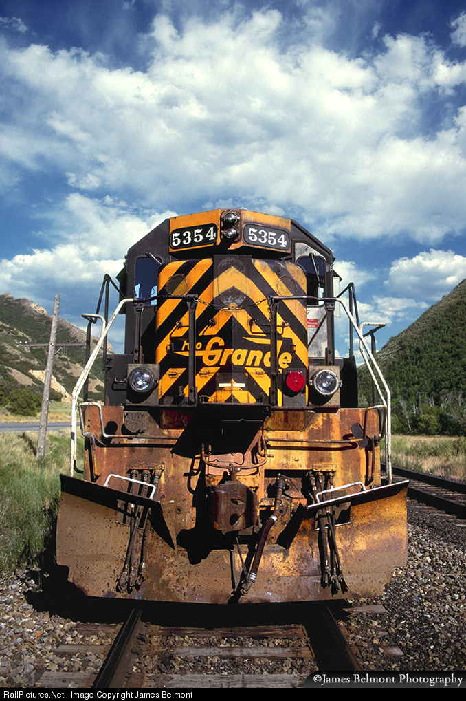 Rio Grande SD40T-2 No. 5354 has coupled to the rear of the LJI44-22 and prepares to shove the 'Dirt Train' east to Soldier Summit the afternoon of July 22, 2000. 5354 has received the so-called 'Helper Nose Job' with Grande Gold and Black striping extending to the upper nose area, over the metal plate installed to block the gaping hole that once housed the gyralite. This Tunnel Motor was built new for the D&RGW by EMD in October 1974 and was retired the UP 9865 on January 24, 2008.
