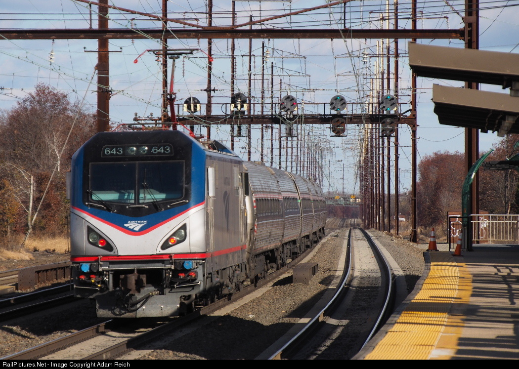 ACS-64 #643 shoves a Keystone Service train past NJ Transit's Edison Station en route to New York. With the Sunday after Thanksgiving being such a busy travel day, this train is longer than usual, featuring six cars, including ex-Metroliner cab cars at both ends.
