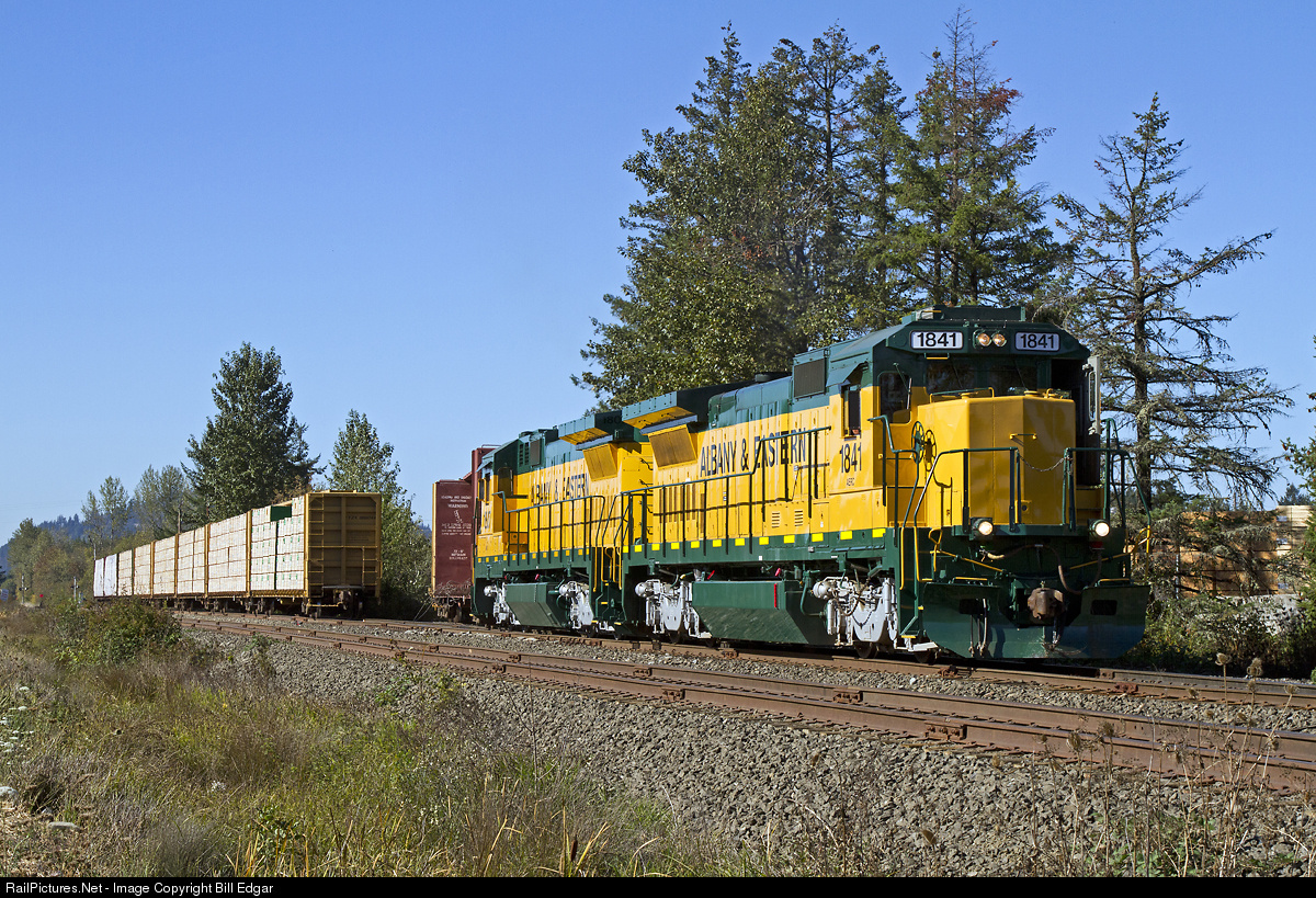 Albany & Eastern Dash 8-40Cs 1841 and 1807 show off their fresh paint while switching the Weyerhaeuser mill near Waterloo, just south of Lebanon, OR. This crew starts the day with a run from Lebanon to Albany and back, then will handle the Crabtree log re-load if needed, as well as switching Weyerhaeuser. The railroad is made up of a combination of former SP and BN (Oregon Electric) lines, and this mill is on an OE portion between Lebanon and Sweet Home.