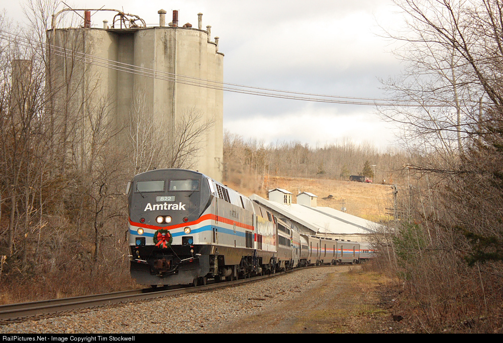 | The deadhead move of the Amtrak / Norfolk Southern Toys for Tots Train heads south through Howes Cave, NY, passing the landmark cement plant on the former D&H. The train was on its way to Binghamton to be positioned for the northbound run of the train the following day. |
