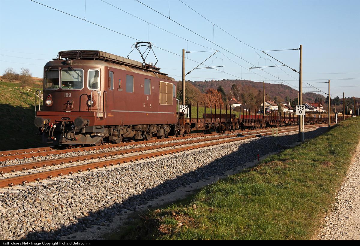 | BLS Re 425 189, built in the early 1970s, is pulling empty freight cars Singen (Hohentwiel) - Basel (- Dunkirk, France). |