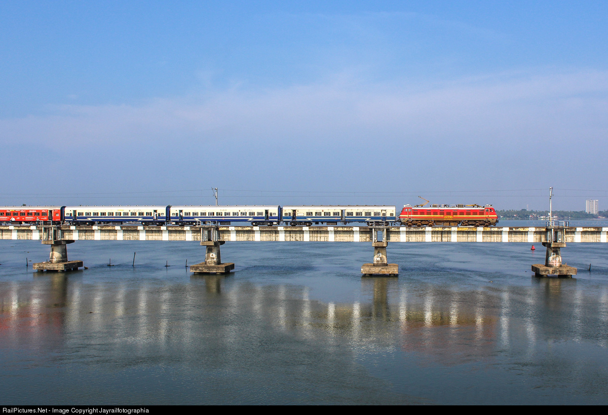 ERODE WAP-4 with Kozhikode bound Jan Shadabti Express crossing Aroor - Kumbalam bridge at a speed of 20 kmph due to speed restriction