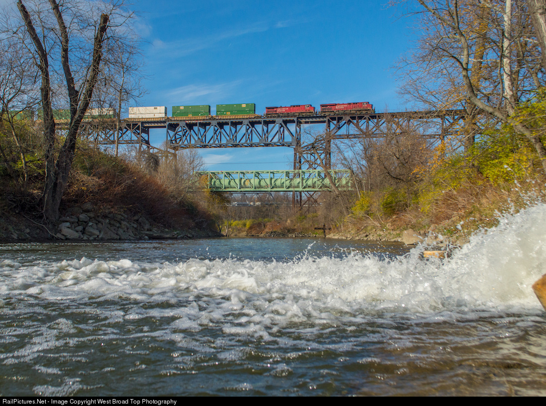CSX Q166 hustles across Short Line Trestle with CP 8932 & 9597 in charge as the mighty Cuyahoga rages on 160 ft below