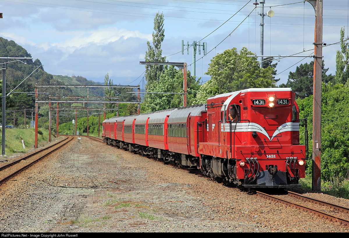| 1431 was built by Clyde Engineering in NSW in 1957 for NZ Railways. It was sold to Steam Incorporated in 1988 and, after restoration, returned to mainline service in 2009. Working a Grand Circle excursion via Levin to Palmerston North and back to Wellington via Wairarapa Line, it is seen approaching Manor Park in the Hutt Valley suburbs. |