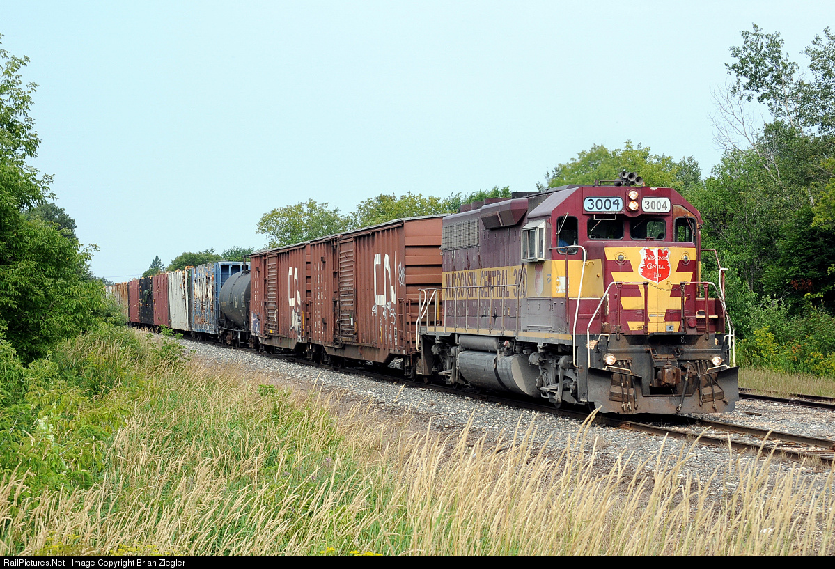 The local led by Wisconsin Central GP40 3004 heads east from Newberry MI with a cut of logs. tank and boxcar revenue.