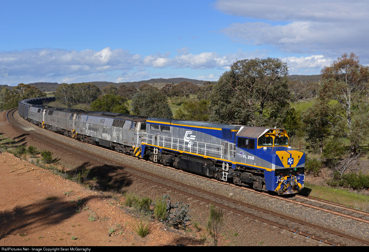 | The Qube box grain train runs out of Minto on a cool afternoon as 1263N empty containers to Goulburn behind locos VL358, MZ1432, MZ1431 & MZ1433. 2 of the 3 Danish 1400 class locos were attached for locomotive balancing purposes. |