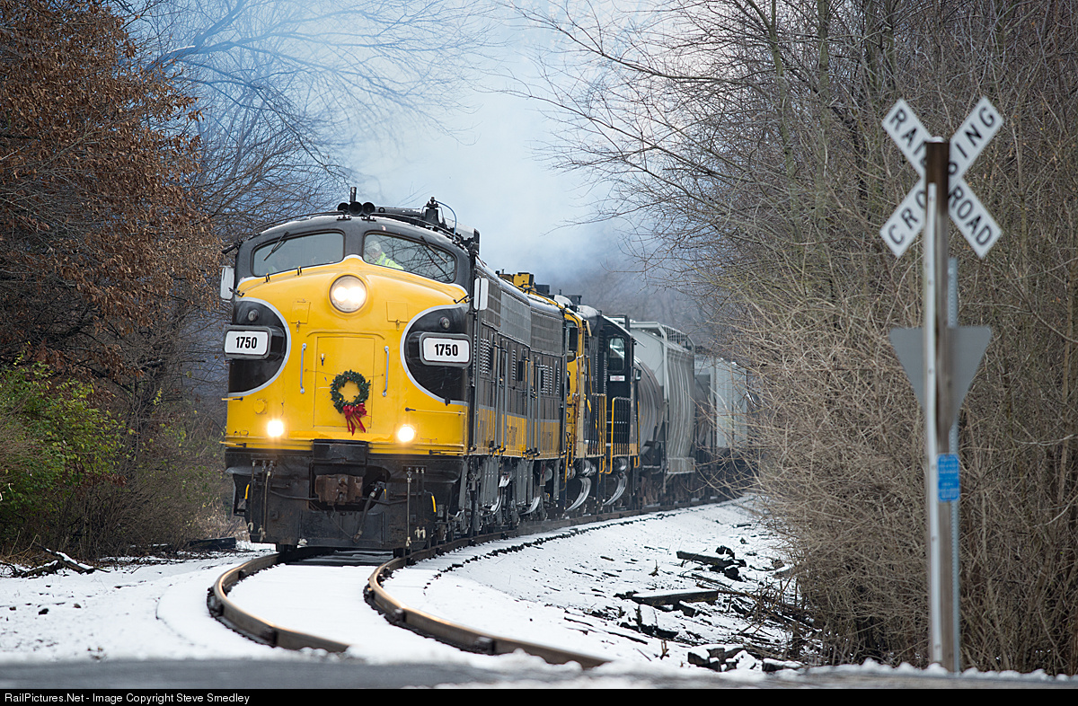 With an A-B-A lashup of FP9, F9B, FP9 and two former Santa Fe GP20's, Keokuk Junction Railway's Westbound train bound for LaHarpe, Illinois begins its attack on Glasford Hill on Monday, December 5, 2016. The lit Christmas Wreath is left over from the seventh annual Santa Train, as it sways back and forth on the nose as the train approaches Reed City Road at Mapleton, Illinois with 51 cars.