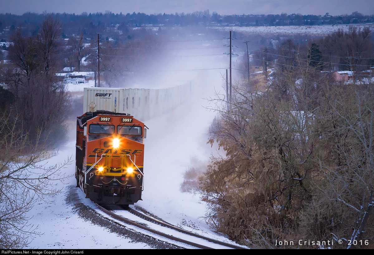 Overnight, snow fell across the Front Range giving the area's first snow of the season in decent accumulations. The weather system also brought a pocket of cold air that settled into the state. The temperature is at 13 degrees and gradually falling as the late afternoon progresses on. Seen here, BNSF ET44C4 No. 3997 leads the hot Alliance, Texas to Portland, Oregon Q-Train through the big curve at Church Lake in Westminster, Colorado on December 7, 2016.