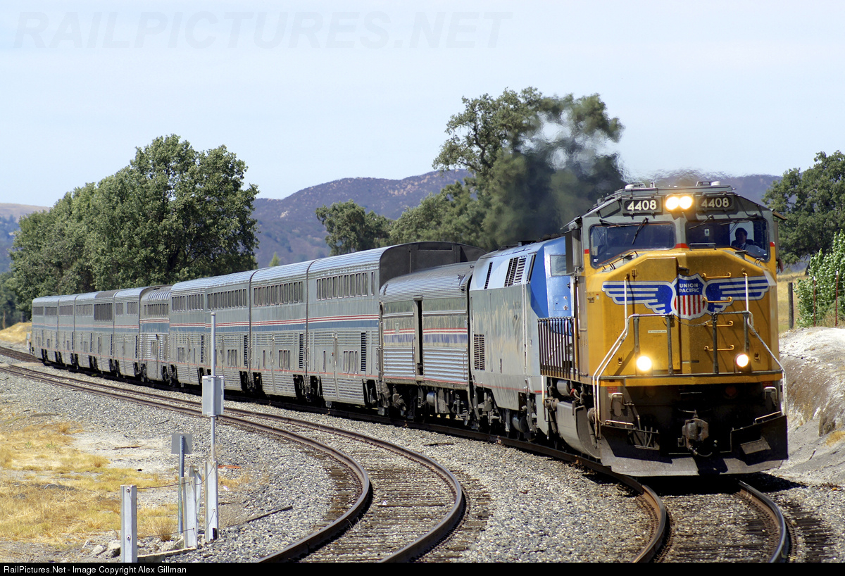 | Back when power shortages in Seattle seemed to be a regular occurrence for Amtrak, it wasn't all that uncommon to spot a UP or BNSF unit on the point of the southbound Coast Starlight. While Amtrak could scrap together a spare unit out of the Oakland yard to replace the freight motor during the train's station stop in Oakland, this was both rare and time consuming - often adding an hour delay to the train's time. On this hot afternoon in Santa Margarita, the more common result shows as UP 4408 leads Amtrak 11 into the small community of Santa Margarita on its approach to Cuesta Pass. |