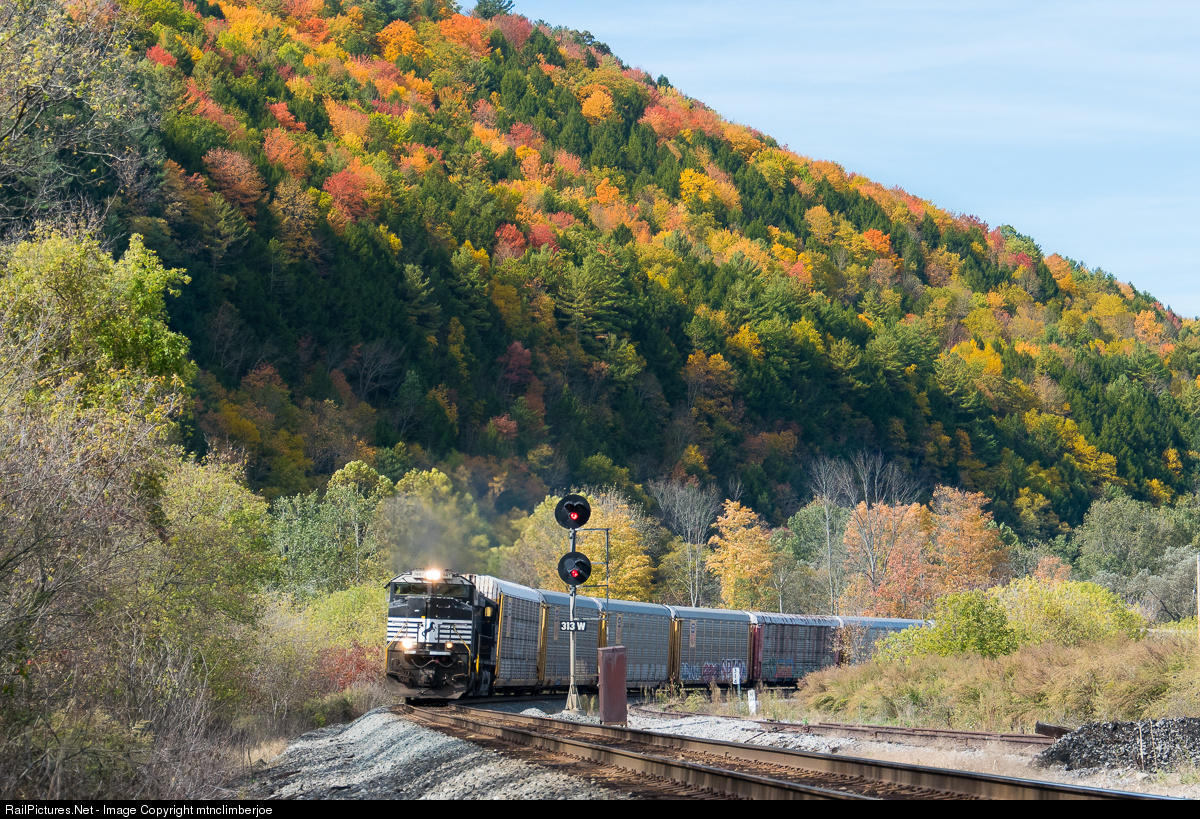 NS eastbound autorack train 28N clears CP 313W on the Southern Tier with the hillside ablaze in early fall colors at Cameron.