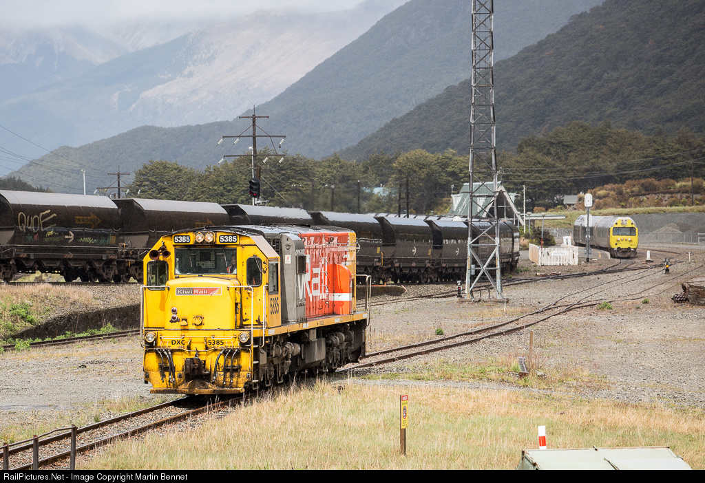 | DXC5385 runs to the turntable at Arthur's Pass, after arriving hauling Silver Fern railcar RM30 on a charter. The RM (visible in the background) was required to be loco hauled due to lack of a qualified crew. |