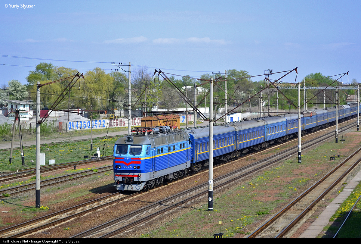 The passenger electric locomotive CHS4-084 with passenger train #107 Astana - Kyiv. This train passenger is canceled. And usually passenger cars of this train was in property of Kazakh railways (KTZ), but in this photo can see passenger cars of Ukrainian ralways (UZ). This photo was photographed at 14:10.