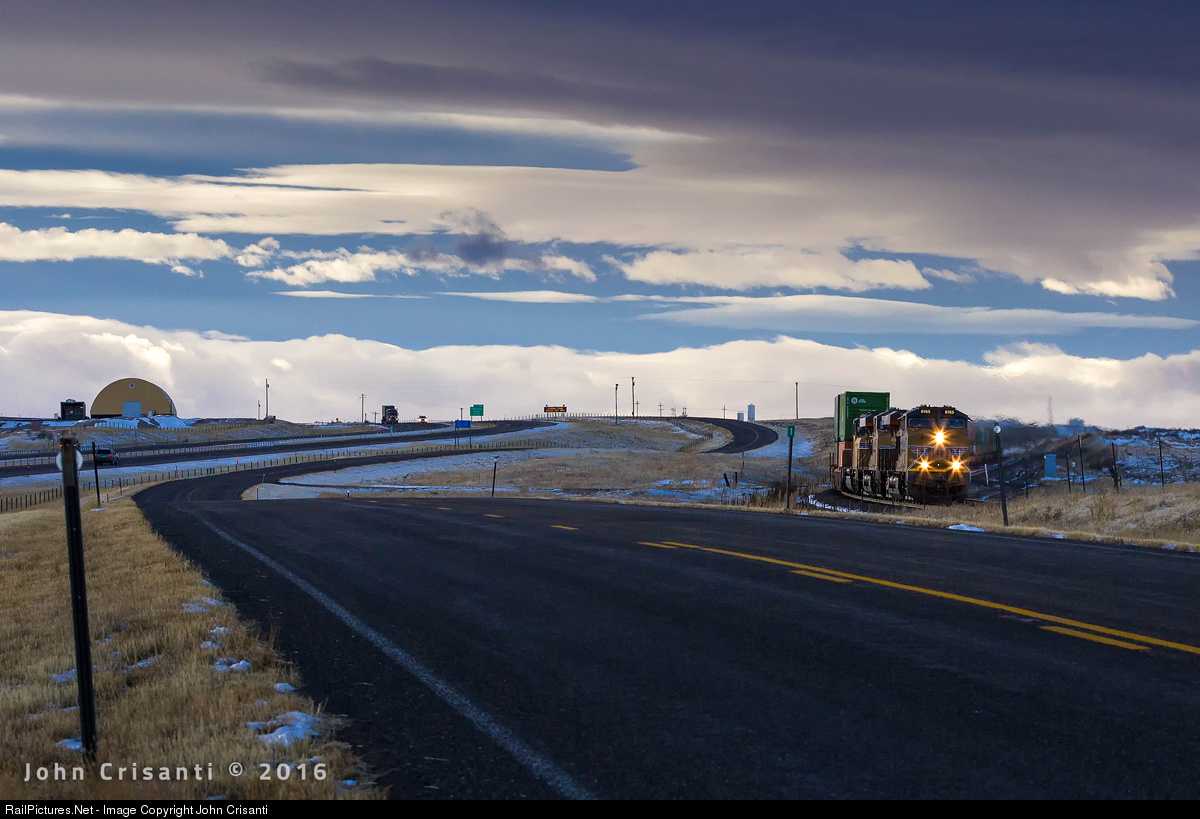 The sun hides behind clouds as a fast moving eastbound Z-Train led by Union Pacific ES44AH No. 8155 races down Sherman Hill on Track 2 along Frontage Road and I-80 east of Granite, Wyoming on December 9, 2016.