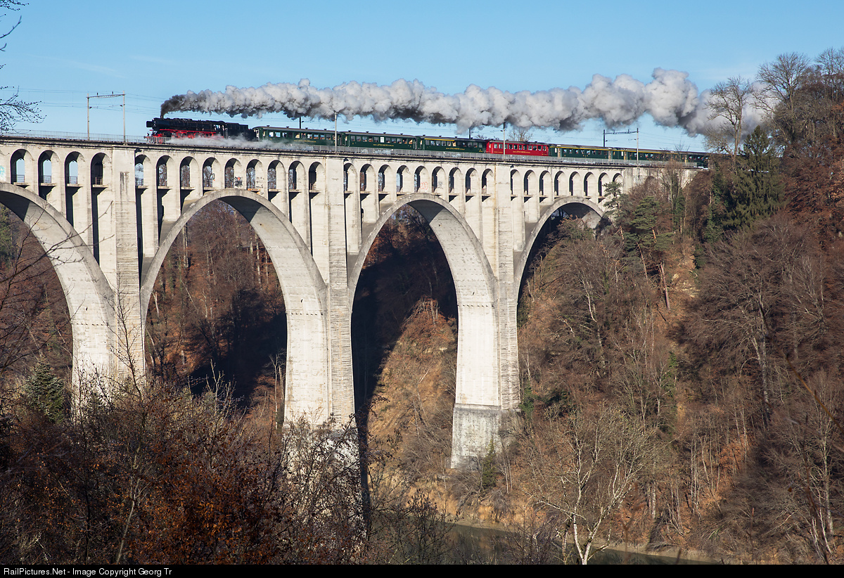 Steamtrain from Lyss via Berne-Fribourg-Lausanne to Montreux for the Christmas Market. The former german express train "Pacific" 01 # 202 is pulling the long train over the 82 meter high and 340 meter long Grandfey viaduct, built in this form in 1927. A first bridge was built here between 1857 and 1862.