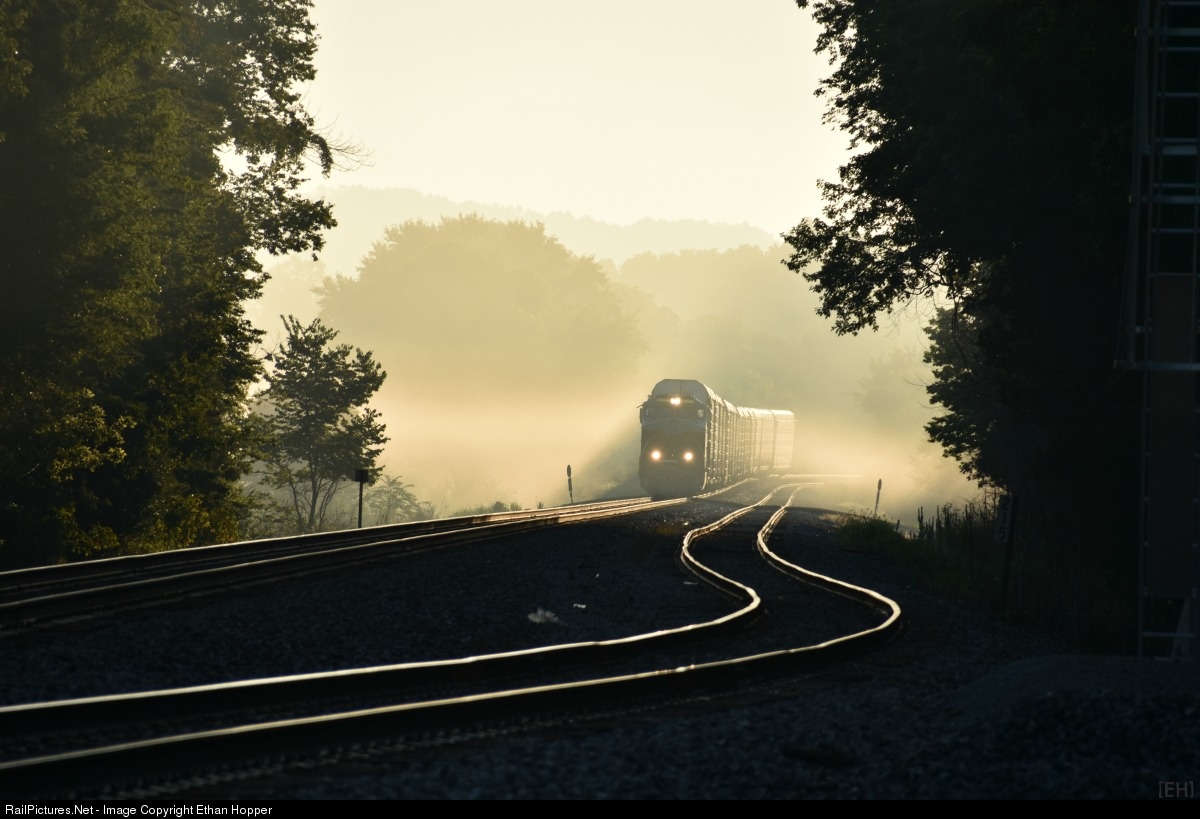NS 8101 leads 121 through the early morning fog of the central Indiana countryside.