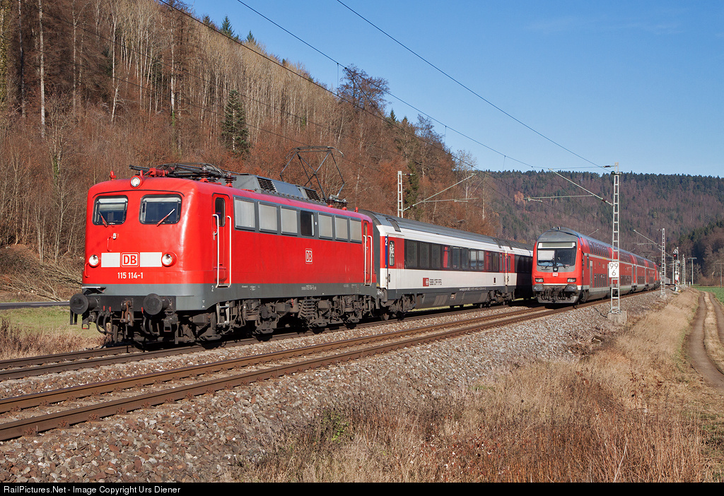 | The 1957 built 115 114 is still used in daily business. She is pulling IC 183 from Stuttgart to Zürich, whilst RE 19034 to Stuttgart is waiting in the siding of Grünholz. |