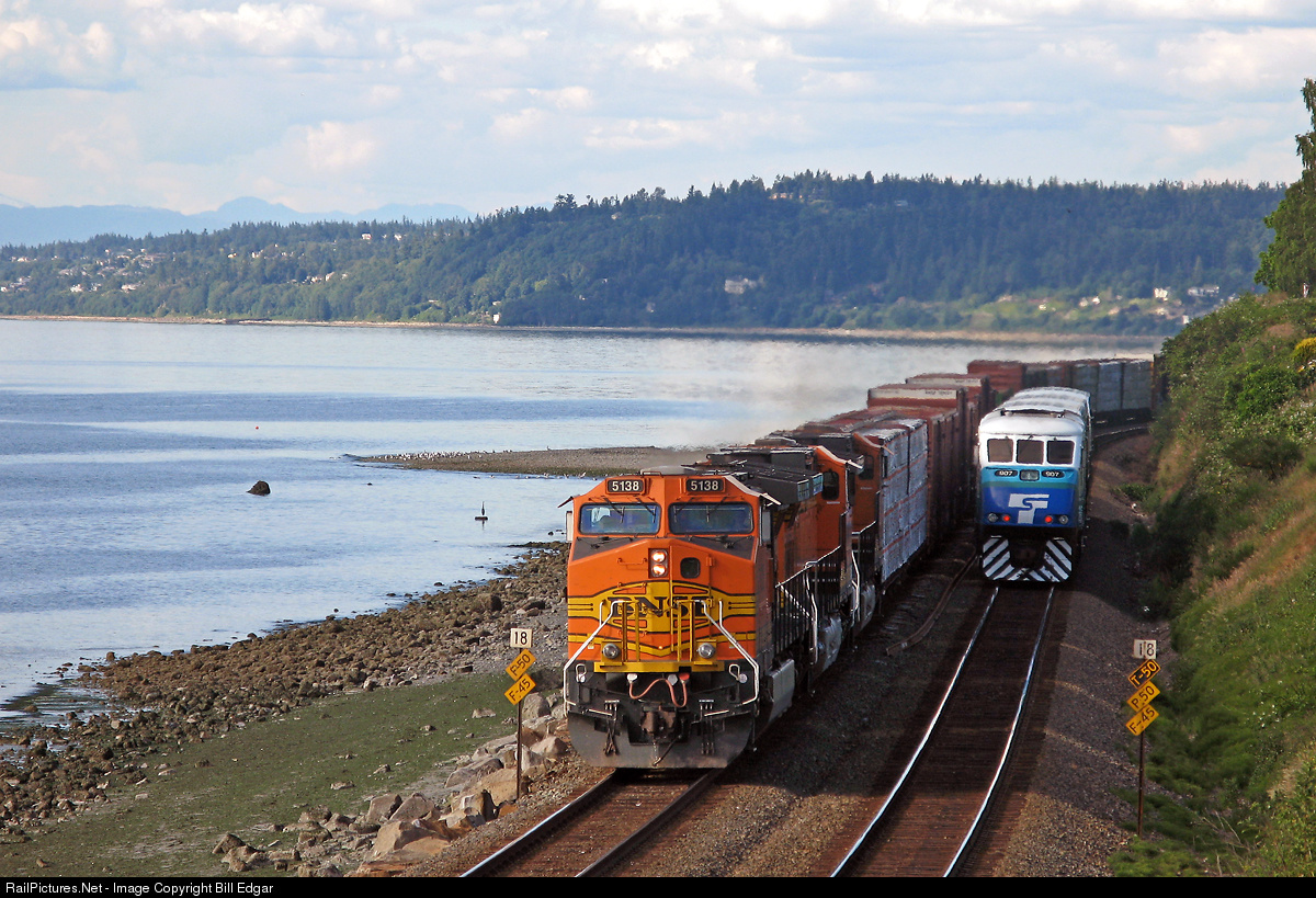 BNSF 5138 on the Everett-Pasco manifest takes a breather at MP 18 along Puget Sound in Edmonds, WA while a Sound Transit commuter being pushed by SNDX 907 heads north toward Everett. Just south of MP 18, BNSF remains single track for a couple miles through Edmonds. Grading for a second track has been in place for several years, but as of 2016 the track has not been put in place.