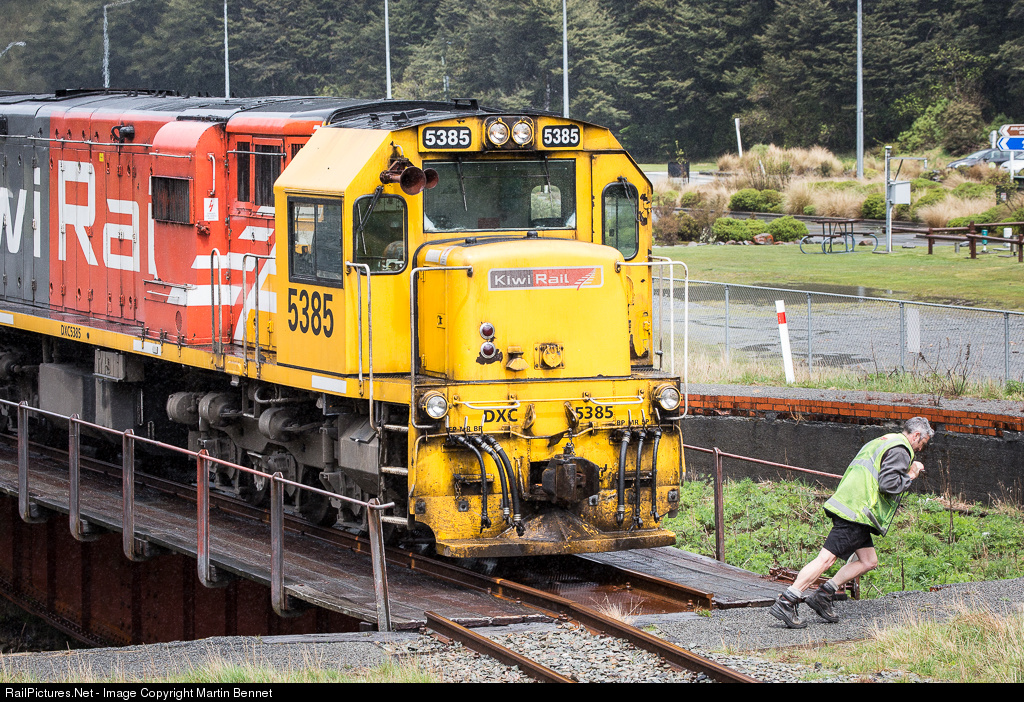 A KiwiRail driver gets DXC5385 moving on the manual turntable at Arthur's Pass.