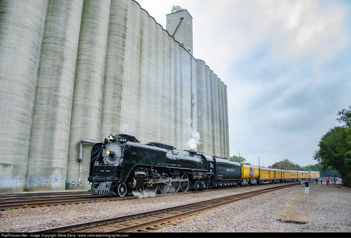 | Union Pacific 844 accelerates out of a display/servicing stop at Lawrence, Kansas. The locomotive is on the last leg of a Marysville-Kansas City trip, part of a larger Cheyenne-Memphis trip. |