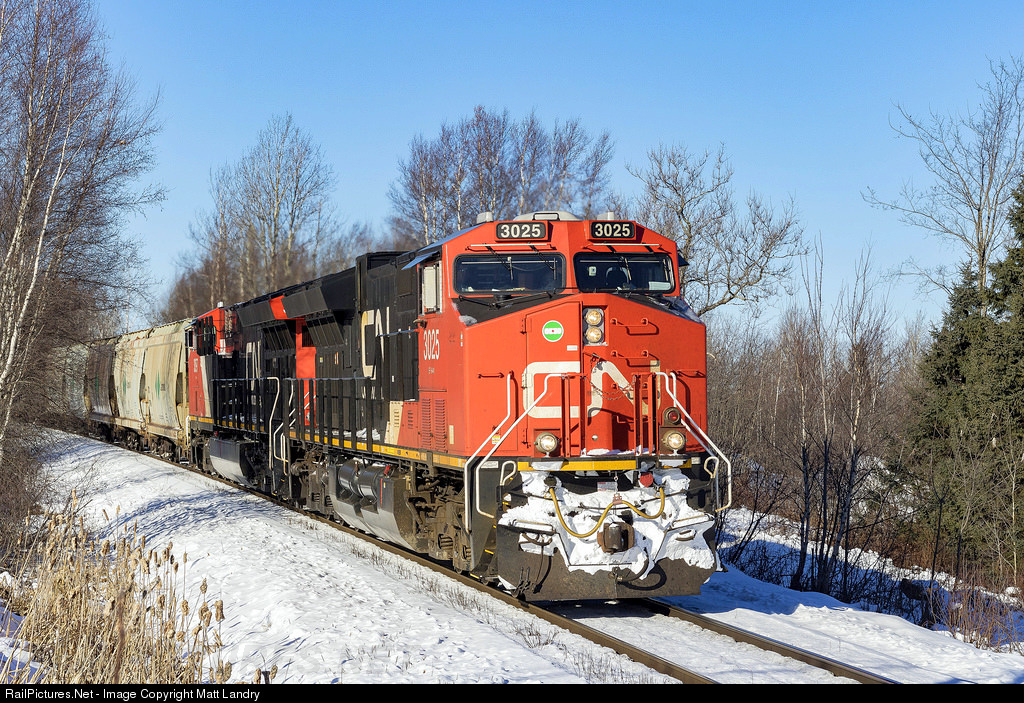 CN 3025 leads a B730 potash train, as the round the bend at Berry Mills, nearing it's next crew change point at Moncton, New Brunswick. After the crew change, they will make the last 83 miles of the trip to it's final destination of Saint John, New Brunswick. Due to bad weather in Manitoba, this train lost about a day and a half sitting in Winnipeg. Better late than never I suppose.