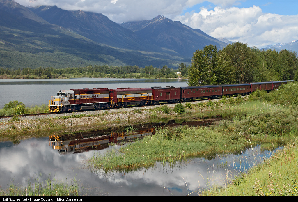 A Canadian Pacific passenger extra operated for Children’s Wish Foundation of Canada rolls south through McMurdo, British Columbia, along the Columbia River over CP’s scenic Windermere Subdivision on July 16, 2011.