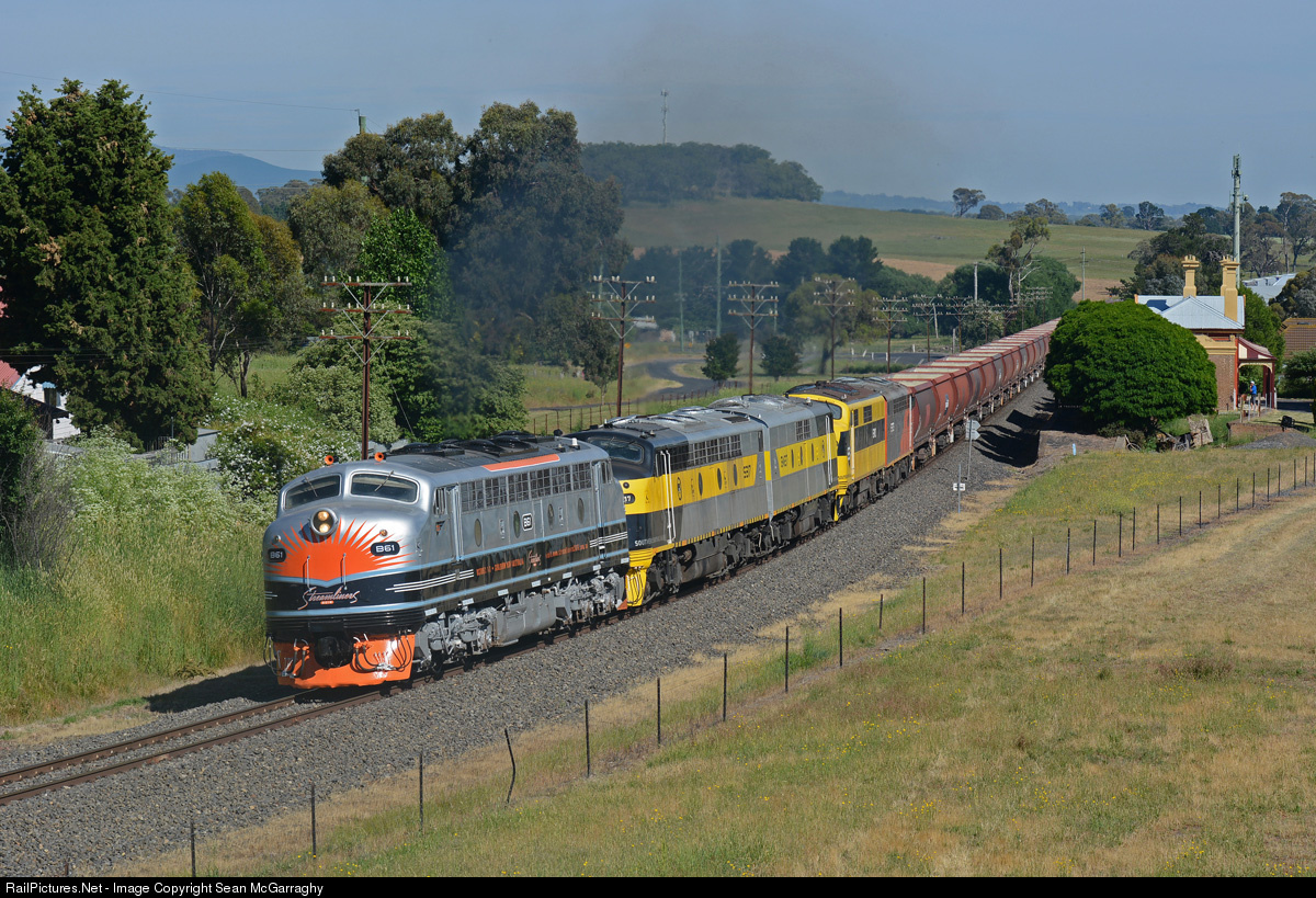 Only just over 2 months after the spectacle that was "Streamliners 2016", five of Southern Shorthaul Railroad's streamliner units including the headline act from the event at Goulburn have been assigned duties of transferring 90 ex Leigh Creek coal hoppers from Port Augusta to Bathurst for conversion into grain hoppers. B61, S317, GM27, GM10 & S302 work 8778N through Millthorpe in NSW's Blue Mountains.