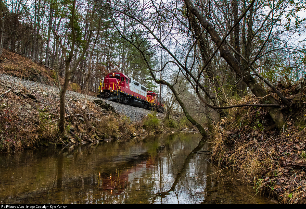 | Georgia Northeastern's 102 job meanders north along Scott Mill Creek near Canton,GA with GP38 #9706 & GP20 #7562 leading four cars. They would set off the 7562 and two flats at Canton for the Universal Alloy train then continue north to Tate with the 9706 and two covered hoppers. |