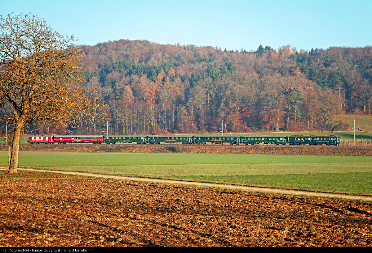 It seems like a push–pull train, but it isn't. Former SBB Re 4/4 I N°10009, built in 1945, now running for TransRail, is pulling a dining car and four passenger cars of Swiss Classic Train. Be 3/4 N°43 is a historic railcar of the former Bodensee-Toggenburg-Bahn.