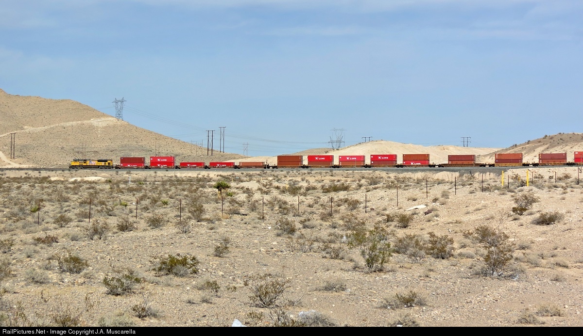 | Union Pacific's Caliente Sub can provide some great views of lengthy trains moving to and from Las Vegas. Here an eastbound stack train is leaving the Las Vegas area and preparing to meet a westbound autorack train coming into the city. UP 8426 is pushing hard on the back to help the lengthy train make its journey over the vast terrain of the Caliente Sub. |